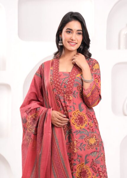 The set is thoughtfully paired with comfortable cotton pants and a lightweight cotton dupatta, making it a perfect blend of tradition and comfort.